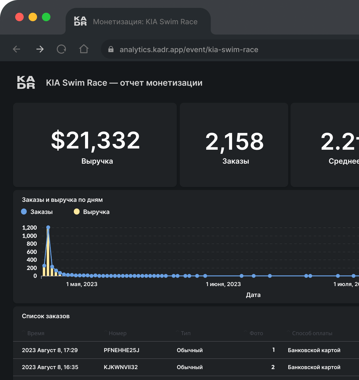 Мы используем KADR на забегах, заплывах, велогонках, OCR и других мероприятиях. Качество сервиса и технологичность всегда на высшем уровне